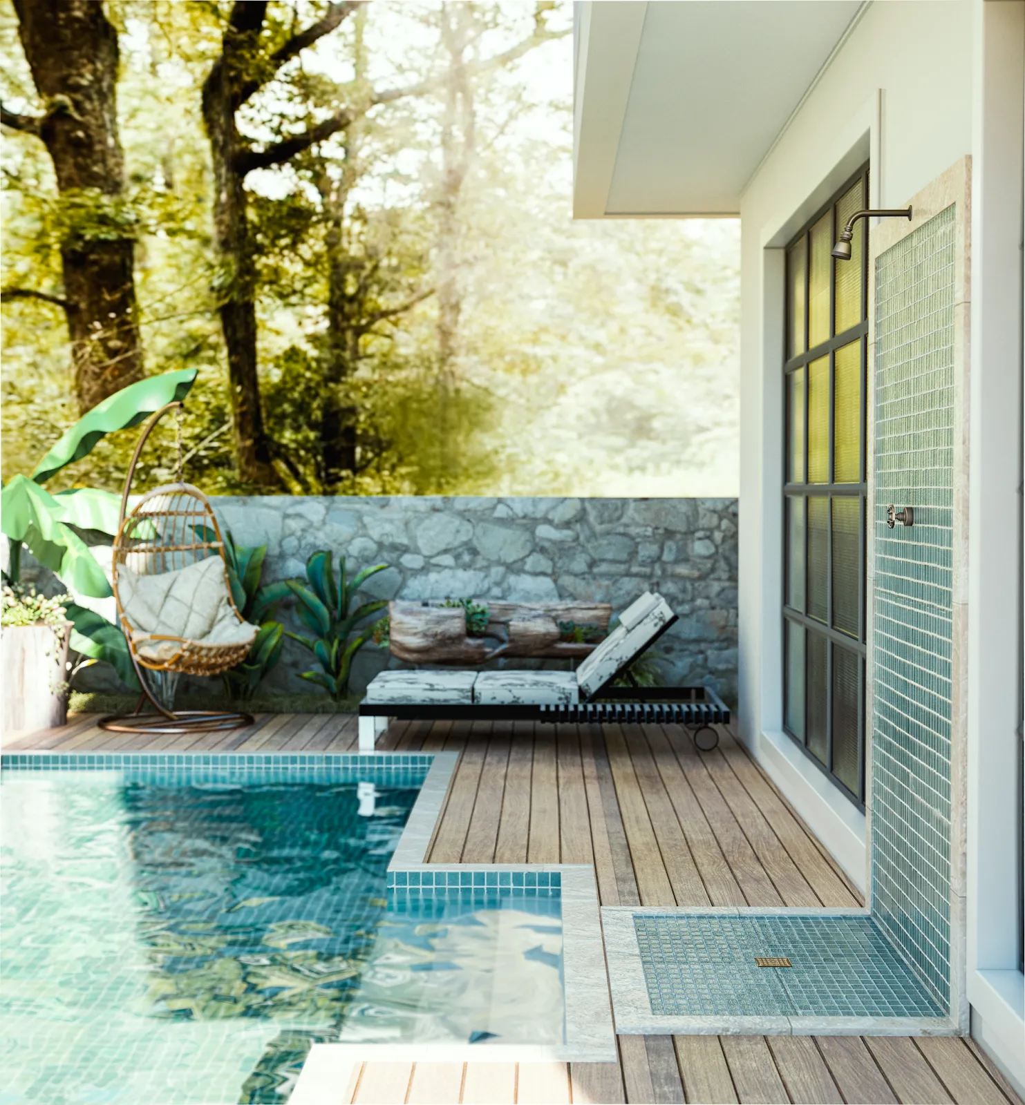 Se seu projeto contar com piscina ou for uma casa de praia, é muito importante também investir em uma ducha para um banho antes e depois do mergulho. Assim, os moradores e visitas poderão tirar, por exemplo, a areia e o cloro do corpo antes de ir para as áreas internas da casa.