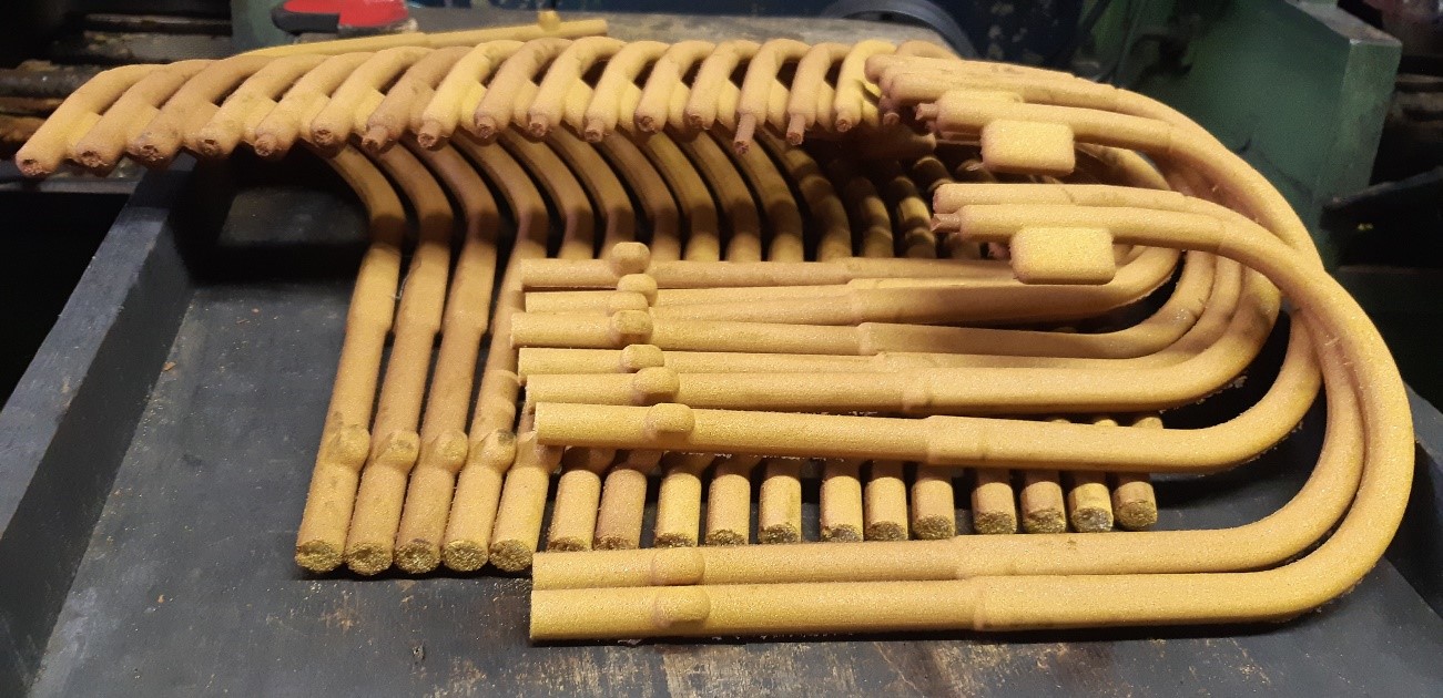 Os produtos têm o canal de alimentação cortado em máquinas de serra e partem para o jateamento, dependendo do acabamento desejado para uma peça bruta. O processo é realizado em uma máquina específica, capaz de lançar em altíssima velocidade pequenas esferas de aço contra os componentes, dando a eles um aspecto visual diferenciado.