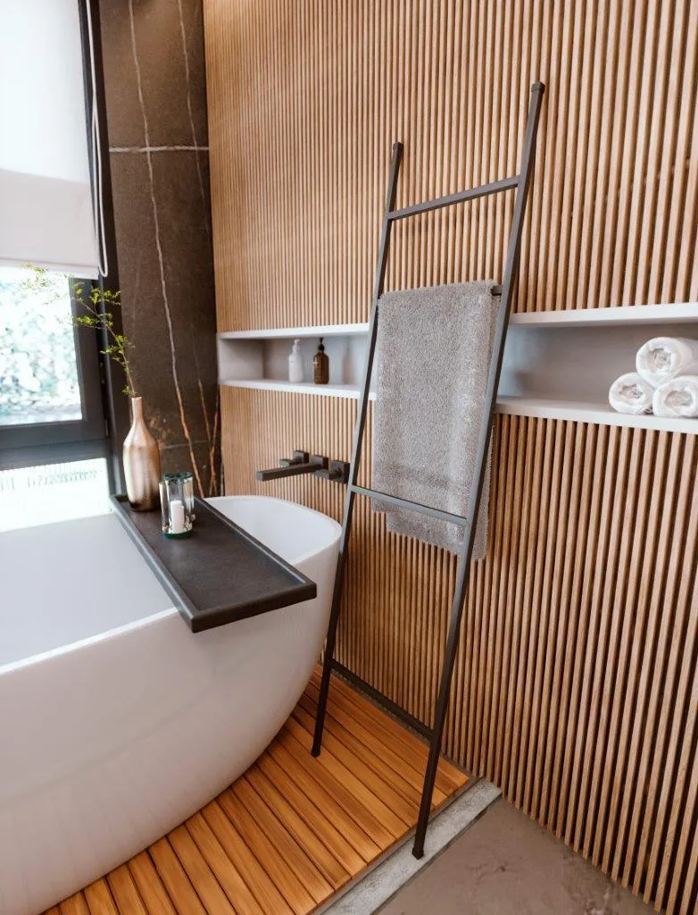 Falando em acessórios, um que não pode faltar em uma decoração no Estilo Mid Century é o porta-toalhas modelo escada da Fani, uma das grandes novidades que trouxemos para a Linha Horus 450.