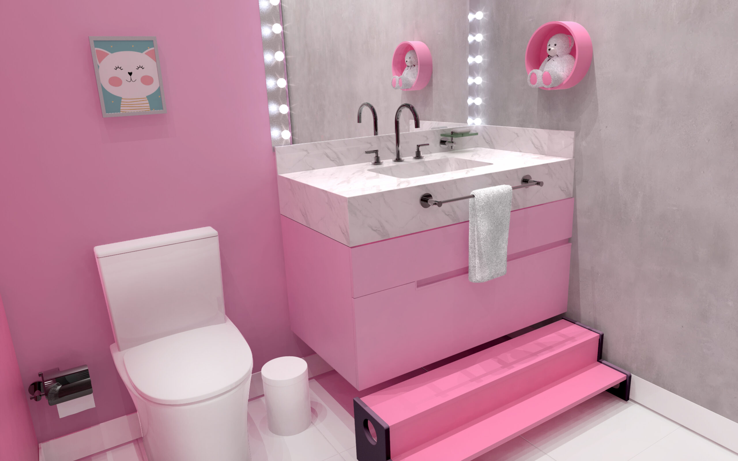 O rosa é a cor predominante, mas deve-se ter cuidado com os excessos, principalmente ao aplicar uma tonalidade mais vibrante, como o rosa pink. Para isso, o rosa pode ser combinado com tons neutros, como branco e creme, e assim criar um ambiente mais equilibrado e sofisticado.